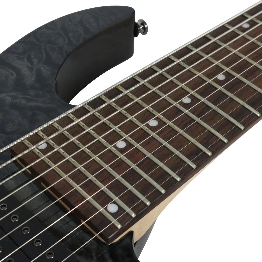 Tocar una guitarra de 9 cuerdas requiere un alcance de los dedos inusualmente largo, por lo que la RG9QM tiene varias especificaciones de ejecución para ayudarte a utilizar las 9 cuerdas. El mástil tiene un perfil delgado Wizard II-9 de solo 21,5 mm de grosor en el primer traste con una longitud de escala de 28". El diapasón es increíblemente plano de 37.4" que te brinda un equilibrio completo entre las cuerdas, mientras que los trastes jumbo brindan un mejor contacto entre los dedos y las cuerdas. La forma del cuerpo RG tiene un contorno suave y dos cuernos extendidos. Cuando se combinan con el talón del mástil de acceso total, estas características crean un acceso ilimitado a los 24 trastes y te ayudan a tocar los estilos de música más desafiantes técnicamente.